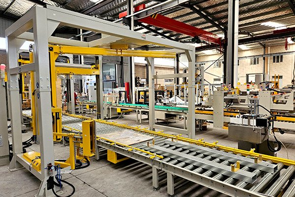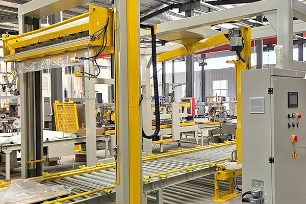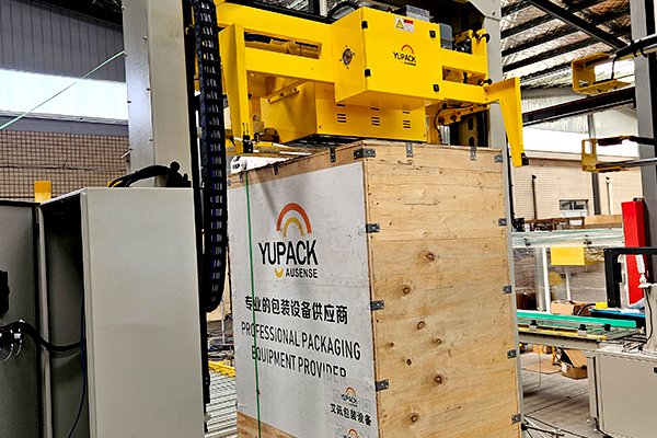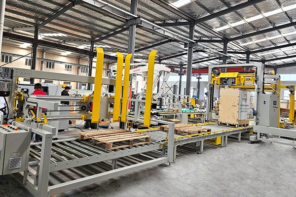 电动工具托盘码垛通过式覆顶膜缠绕捆扎包装线,是由自适应型供栈机、机器人码垛机、栈板穿剑捆扎机、通过式覆顶膜机以及摇臂式缠绕包装机组合而成。自适应型供栈机可根据不同托盘尺寸,自动调整机器并分配托盘,节省了人工换产的时间。