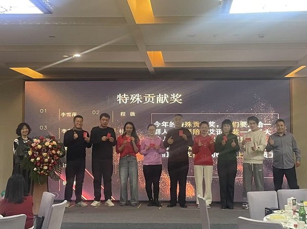 会议还对2024年度工作中有突出表现的员工和团队进行了表彰。其中25名优秀个人在表彰中获奖,财务部获得了带薪休假和旅游津贴奖,一直奋战在车间一线的生产部获得优秀团队称号。