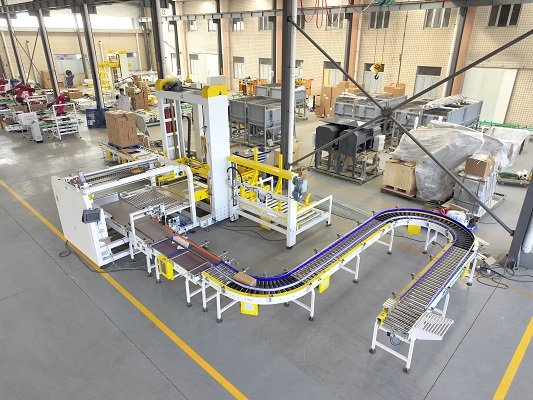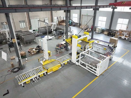 纸箱龙门低位码垛线是由纸箱整理线、低位码垛机、自动供栈机、在线缠绕机以及托盘输送机等设备组合而成。该线体主要针对纸箱的整层码垛而设计,可根据用户提前设计好的垛型,将纸箱提前整理出需要的垛型样式,纸箱处理速度高度33箱/分,较之普通的机器人码垛,效率快很多,同时配合自动供栈及在线缠绕机等自动化包装设备,完全纸箱和托盘的无人化包装,自动化程度高,运行成本低。