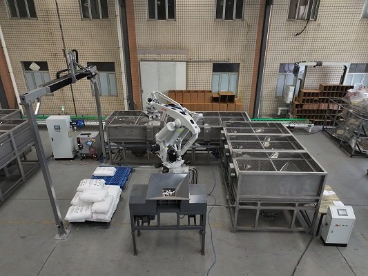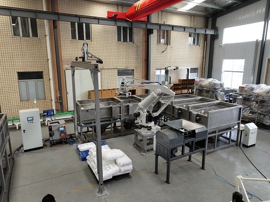 袋子卸垛是目前包装领域非常常见的一种需求方式,用户需要对托盘上的袋子进行卸垛,同时需要将卸下来的袋子进行破包,将内部物料倒入提前准备好的料斗里,有可能只有一种物料,有时也有可能是多种物料按照一定的比例混入料斗中,之后分别输送到指定位置。而破袋后的袋子,有的需要缓存到其他的料箱中,而有的则需要直接粉碎后,再次回收。