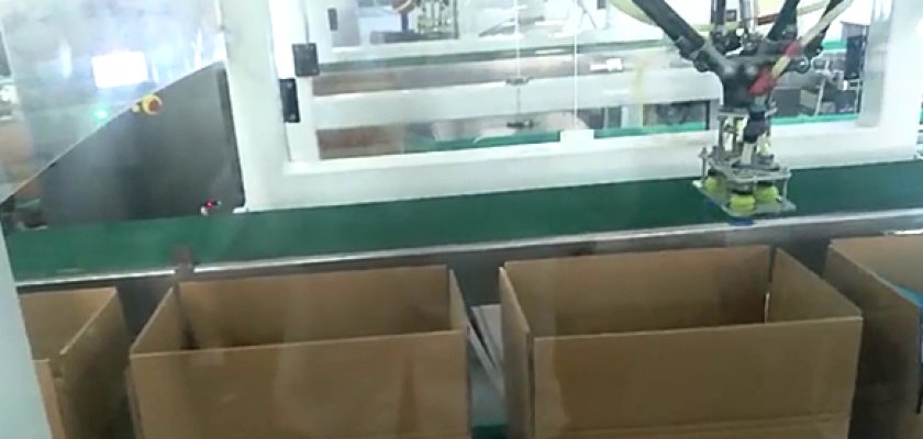 并联机器人装箱机也称蜘蛛手装箱机,是一款速度比较快的装箱机,该机采用PLC控制,配合自动机械手(抓手样式可?。迪侄孕∥锲返淖远跋渥饕?,主要用于小袋产品或小盒产品的的装箱,多用于食品、药品、化工等包装领域。